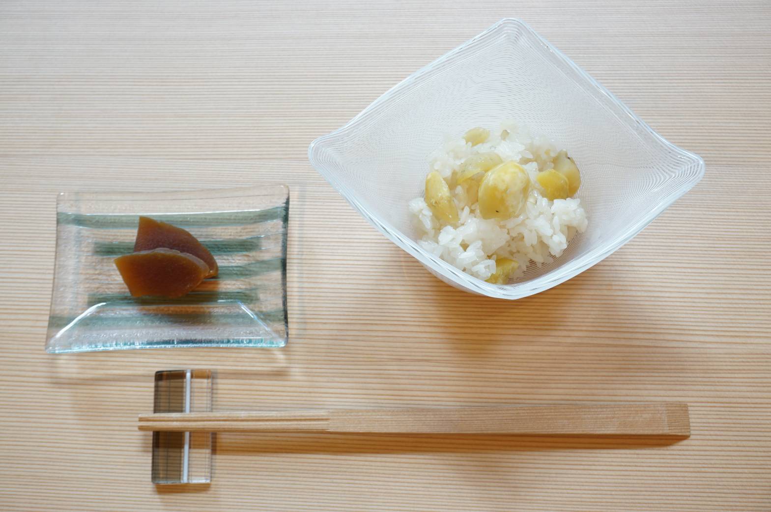 ガラスの涼やかな表情は、木のテーブルにも白いテーブルにも馴染みやすいとお声をいただいています。今日のお料理にどの色を合わせるか、そんな風に楽しんで貰いたいお箸置きです。