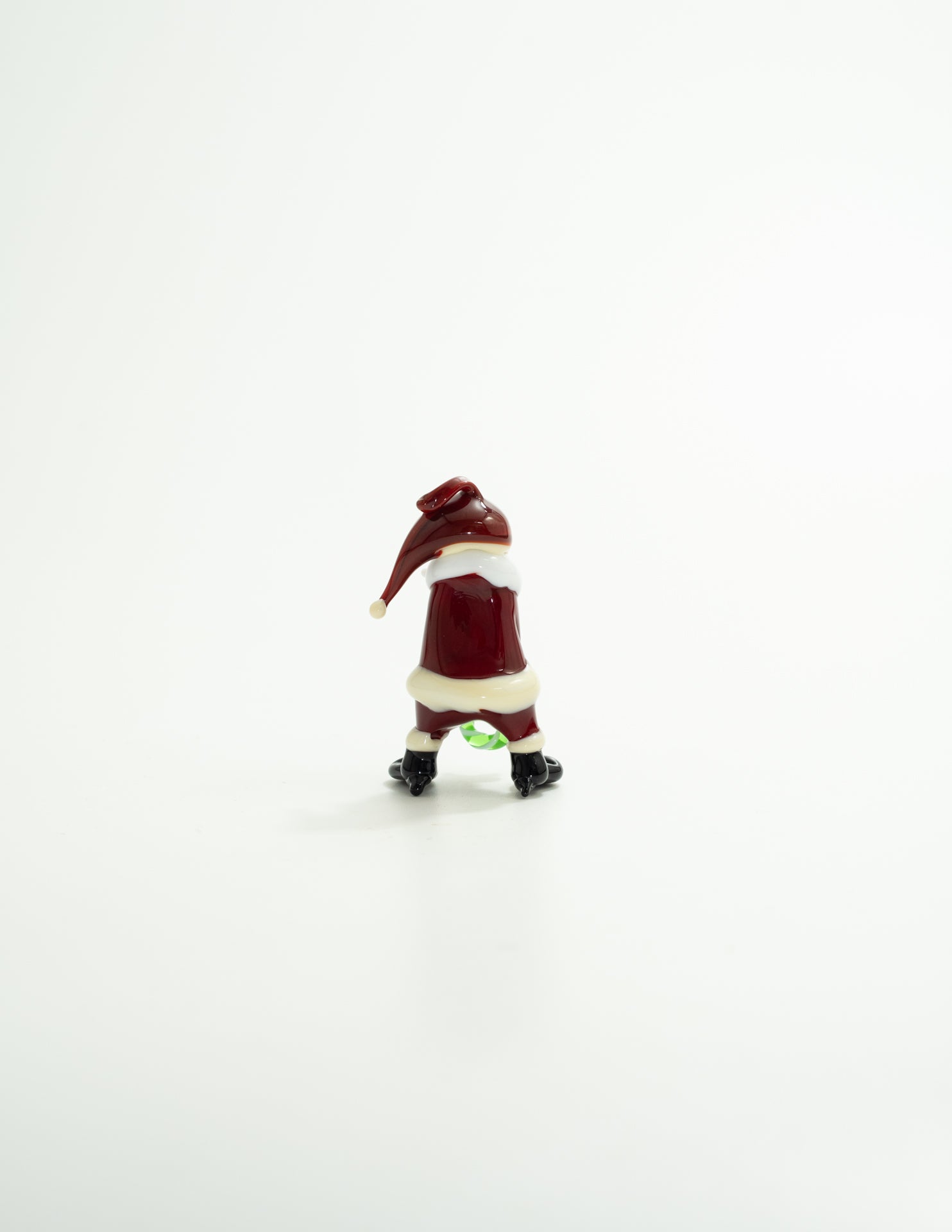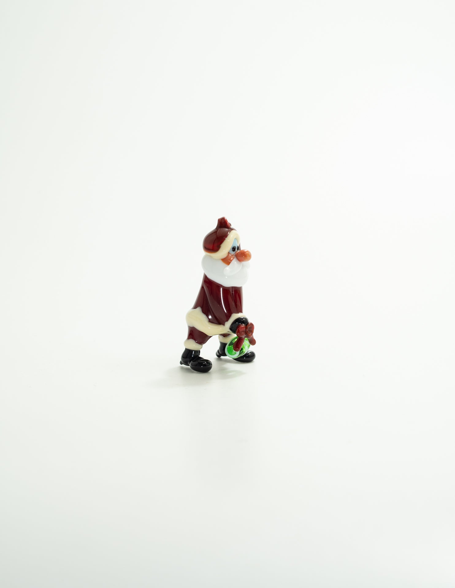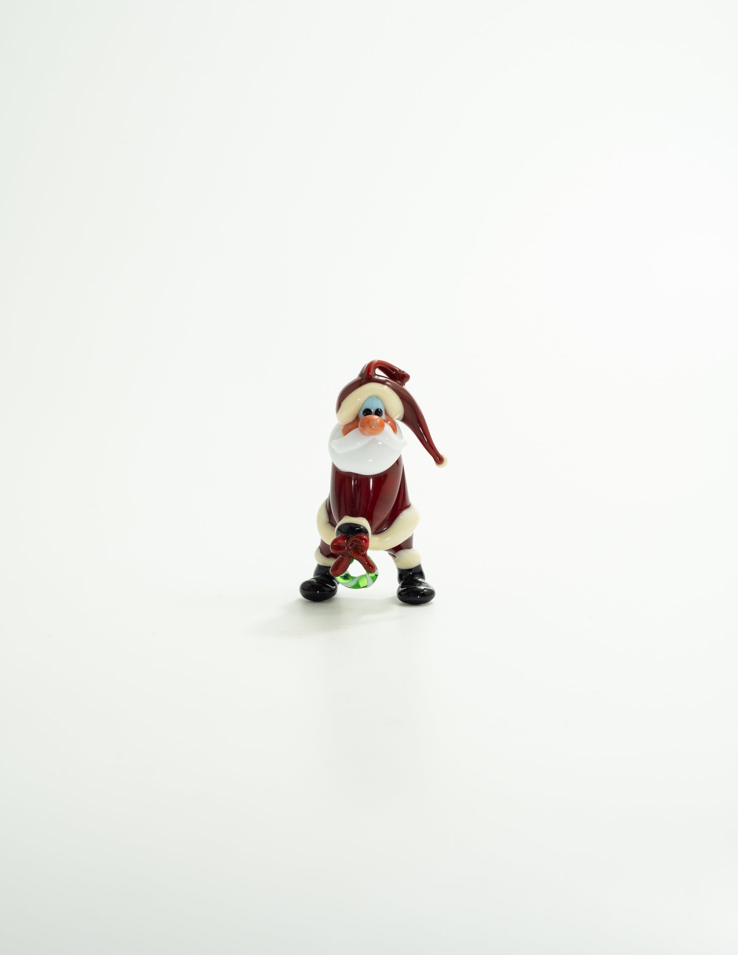 手にしたリースは、熱した緑と白のガラスを極細く伸ばし、より合わせて形作られています。リボンもまた、極細に引き延ばした赤いガラスで丁寧に作られました。